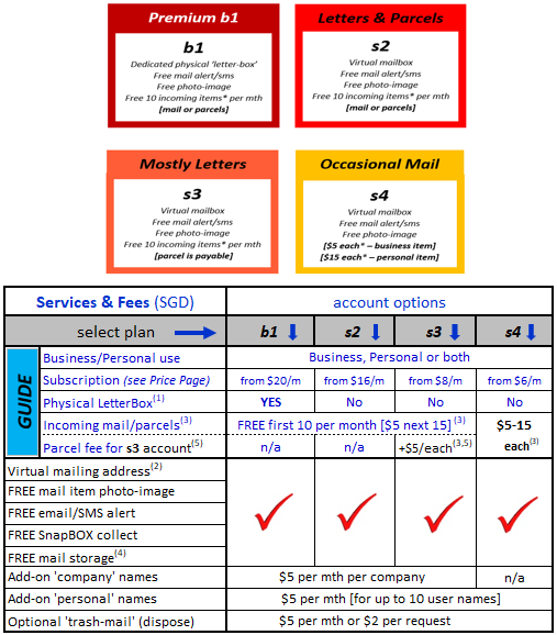 (4) Letters: 3 mths (n/a to b1 account). Standard parcel: 1 mth. (ext: $30/mth)